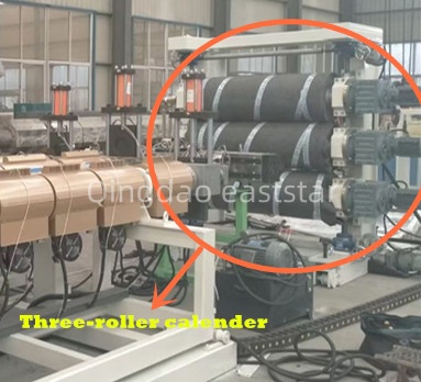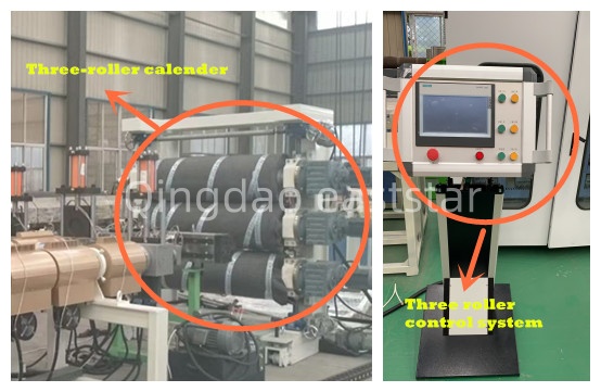 ABS多層共擠板材生產(chǎn)線的模具系統(tǒng)采用衣架式流道設(shè)計,模具寬度2200mm,配備精密的分配器,確保各層材料分布均勻。三輥壓光機(jī)配備Φ450×2500mm鏡面輥筒,輥面硬度HRC58-62,鍍鉻厚度0.08mm,通過特殊多流道設(shè)計確保溫度均勻。輥溫控制系統(tǒng)采用軟化凈水作為介質(zhì),溫控精度±1℃,配備三臺2.2KW熱水泵和三組12KW加熱器,為板材成型提供精確的溫度環(huán)境。